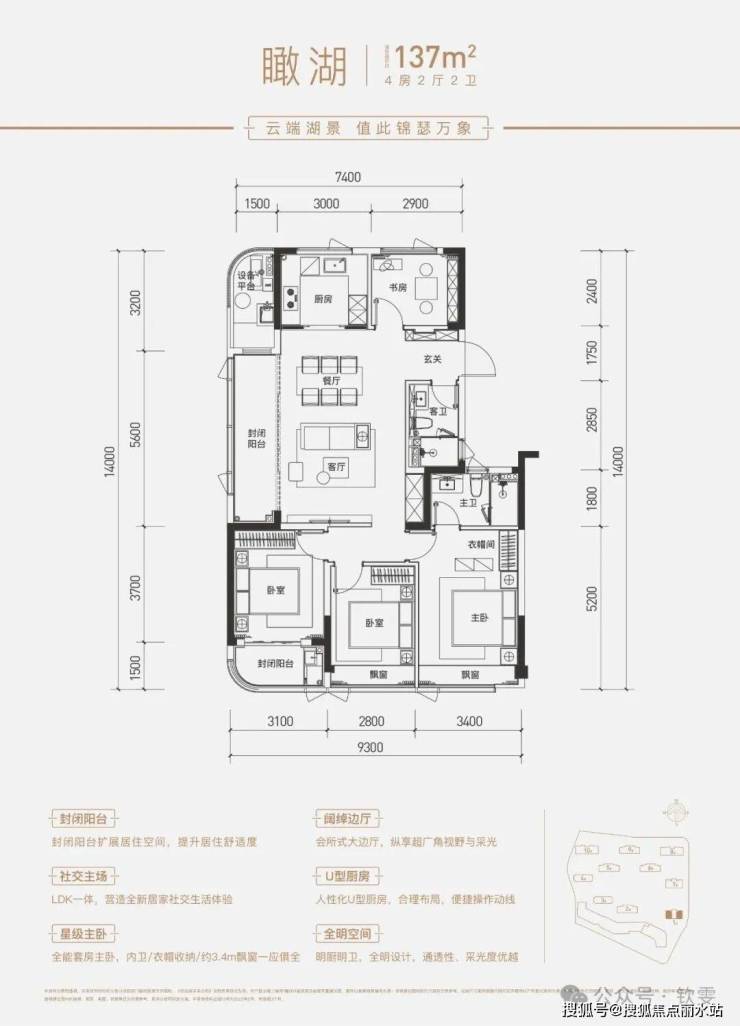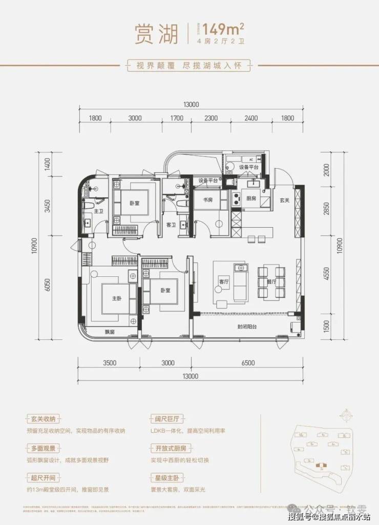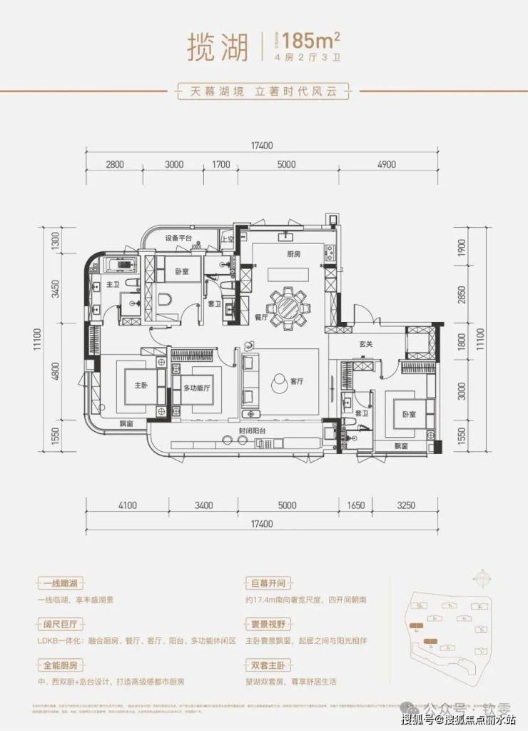 185㎡四室两厅三卫:项目最大户型,也是四房最大户型,主要分布于5#、9#两幢,一线湖景无敌视野,南向四开间面宽超17米,各功能间面积Plus,带大玄关,南向双套房设计,观景阳台面宽9.45米,面积超15方,十分奢侈,北向餐厅和厨房面积也很宽绰。