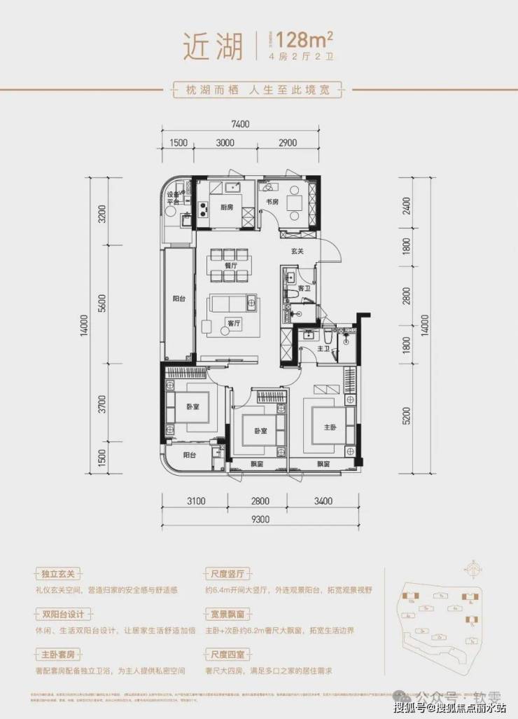 128m²四房两厅两卫:主要分布在6#10#14号楼的边套户型,约6.4米开间大竖厅,连接阳台拓宽景观视野,双阳台设计,居住舒适度更高,浪费面积少,加赠送得房率在89%左右。