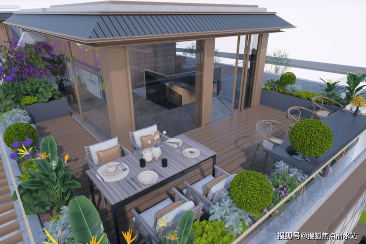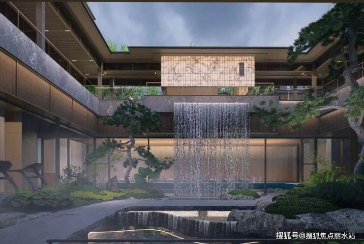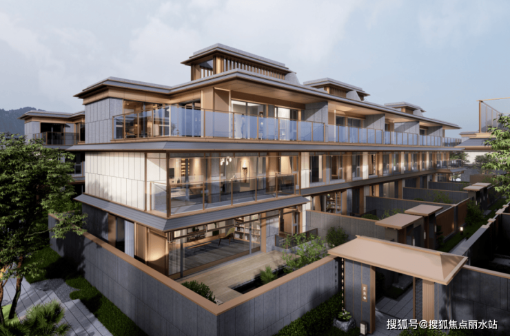 传统宋式建筑的重檐、撺帘杆等元素,融入现代视觉手法,搭配大面积高透玻璃,豪宅气息扑面而来。4F叠墅同样宋韵十足↓