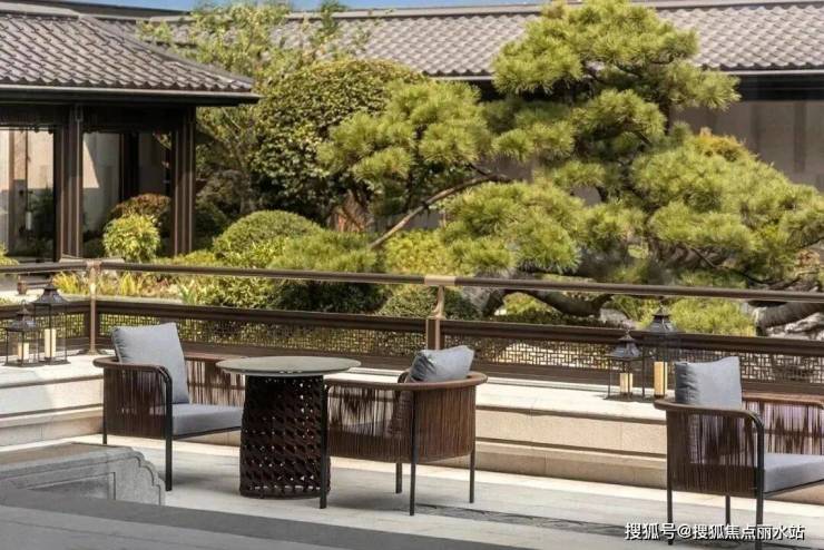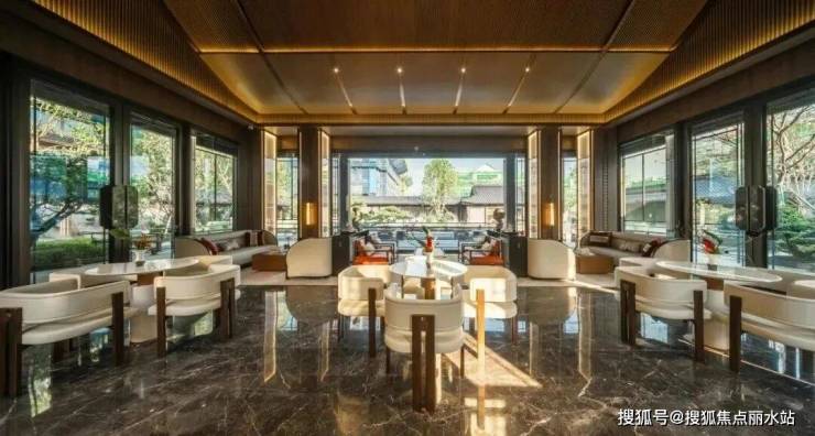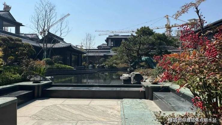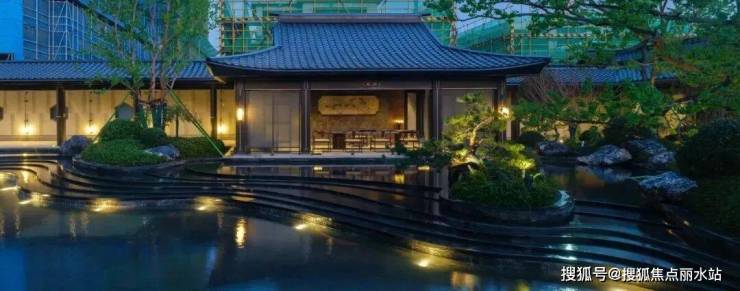 松瀑园景观,灵感源自《千里江山图》,递进式退台设计,瀑布如丝如练,落入碧波水池,水景交融,诗意江南画卷尽收眼底。