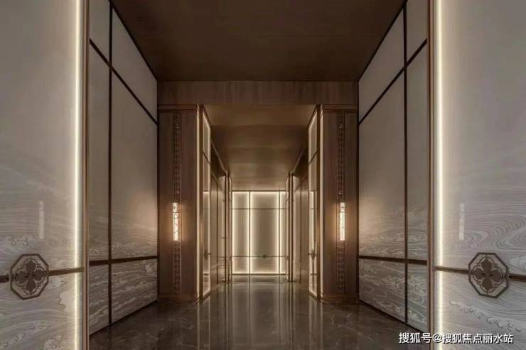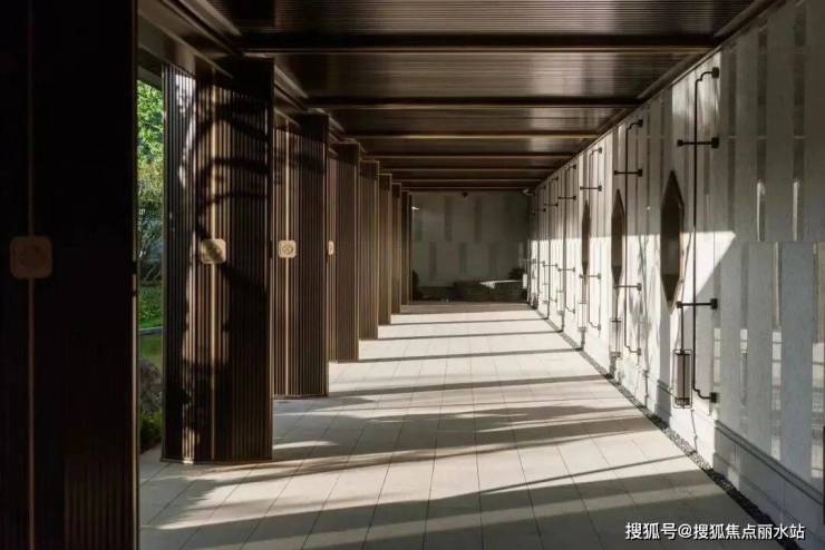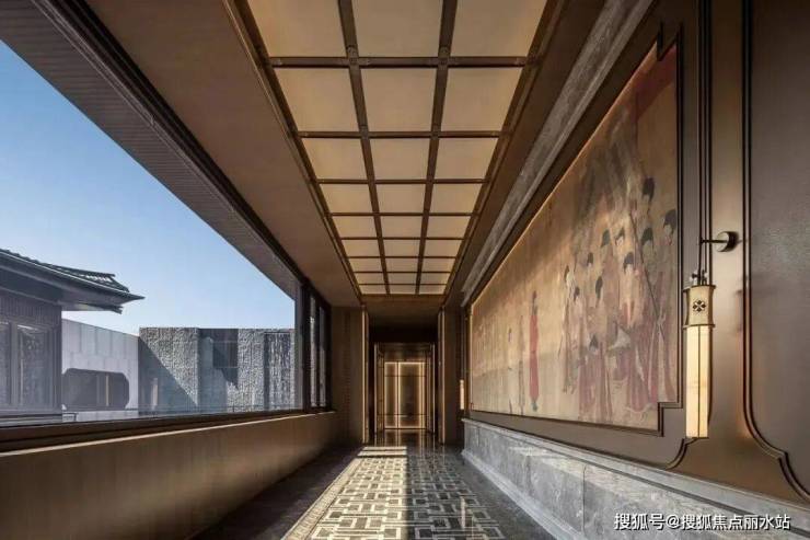 长廊融合唐宋之美,气韵生动,透窗宽敞明亮,壁画人物栩栩如生,格栅有序,金属花格与大理石纹路相映,古典韵味与现代工艺完美融合。