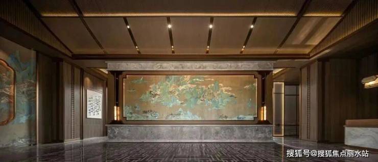 步入前厅,唐代画家李昭道《海天旭日图卷》映入眼帘,古典建筑雄姿,传统山水佳境,柔和暖色调和空间氛围,金属线条勾勒活力与神韵,金色构件彰显古典与现代美学和谐。