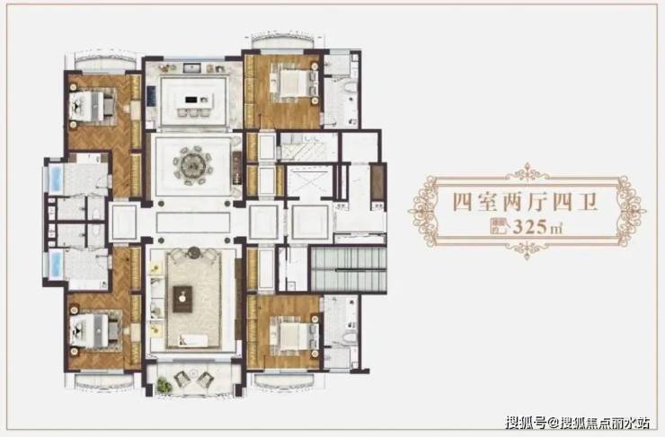 建面325平户型采用十字对称的四叶草格局,每间卧室「平权化」呈现。而且,每间卧室均具备观景阳台、衣帽间、休息区和卫浴空间。
