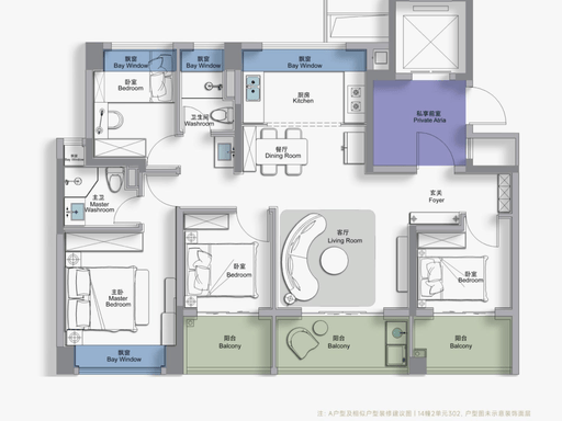 建面约 188㎡四房两厅三卫(大平层):旗舰级大平层产品,一梯一户专属配置,私梯入户彰显尊崇感。五开间朝南,南向面宽超 16 米,超大横厅设计,搭配 270° 观景阳台,尽览社区园林与城市景观;主卧豪华套房,配备独立衣帽间、双台盆卫生间与观景飘窗,打造主人专属私密奢域;四房布局从容大气,适合追求极致居住体验的高端改善家庭。