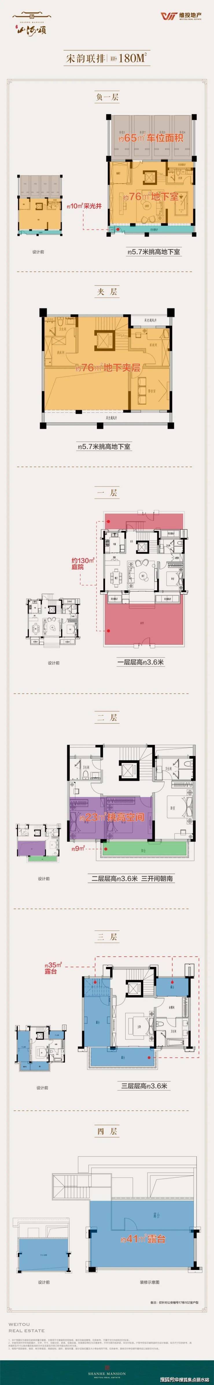 以一套维投·山河颂联排中间户约180㎡的户型为例: