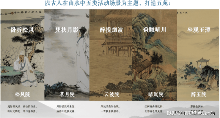 结合山水两大宜居资源,以武汉传世名楼——黄鹤楼为山水画外背景,借鉴古人在山水中的活动,结合现代的日常生活习惯,打造出以下五苑主题: