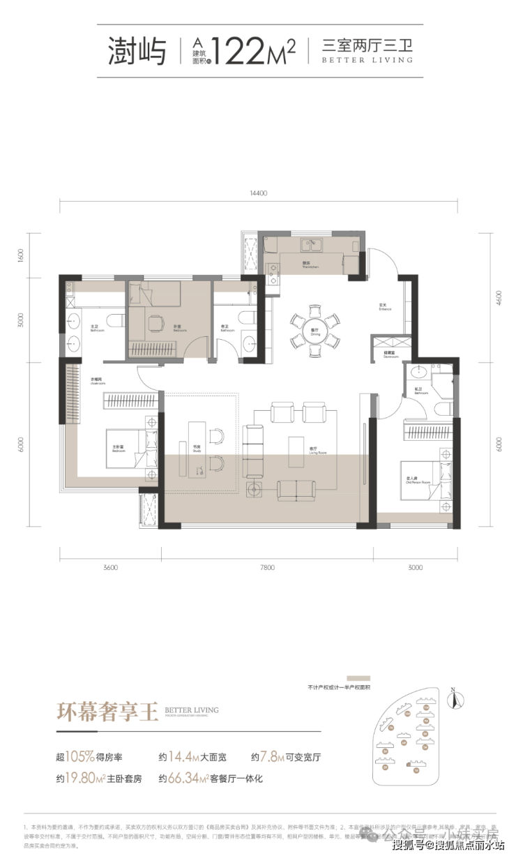 首先,105%的得房率,妥妥的负公摊,对于主城区四代住宅来说,还是非常高的(目前三环内准四代项目得房率能达到95-97%左右就已经算相当优秀了)