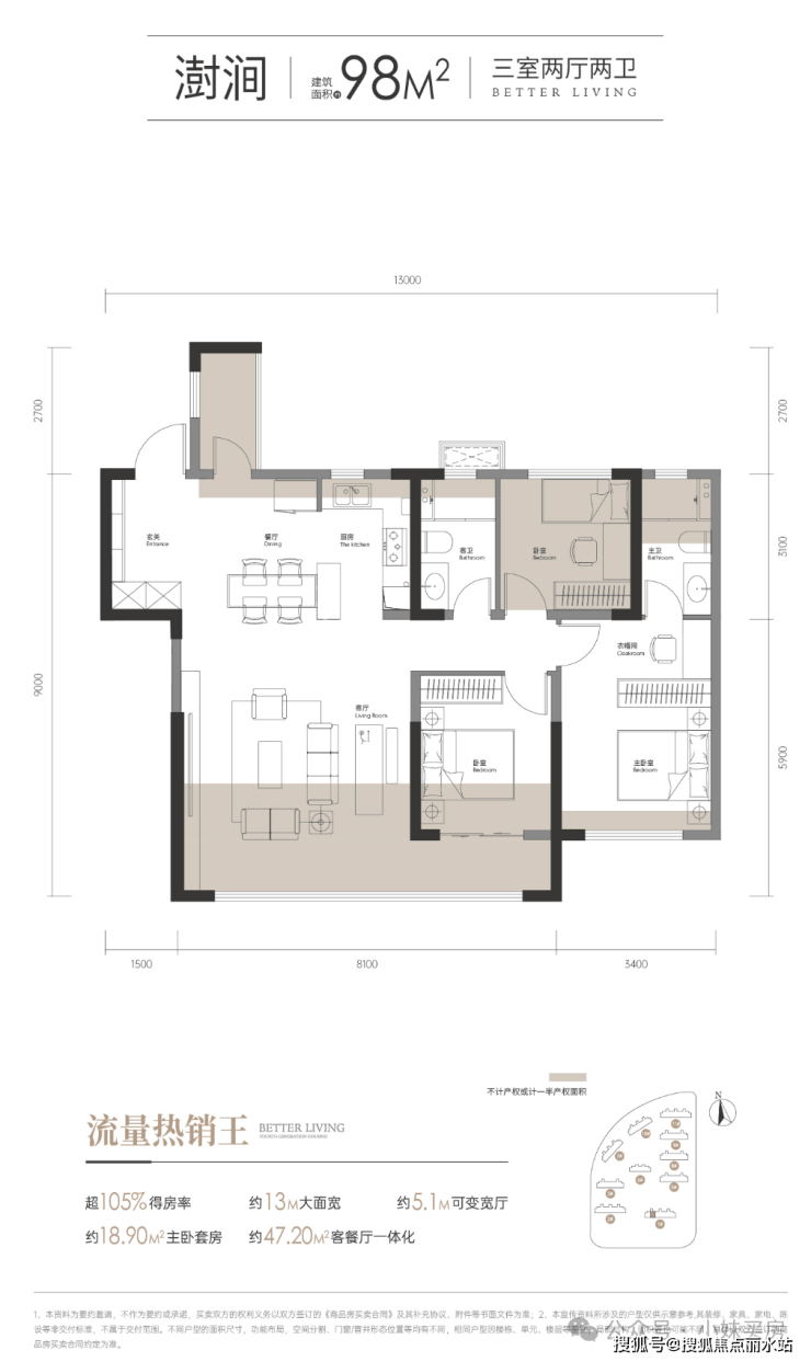 1号楼建面约98平米三房户型