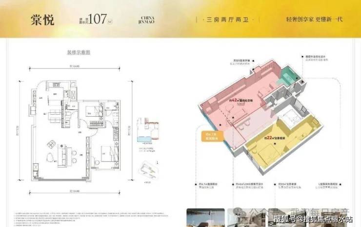 棠悦(建面约107㎡,3房2厅2卫):高层入门级产品,户型方正;约6.7米南向阳台连通客厅和书房;约42㎡LDKG餐客厅一体化,社交场景多元化;内部承重墙少,改造空间大,客厅和南向书房可随意组合。