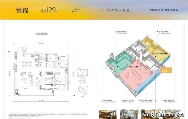 棠锦(建面约129㎡,3+X房2厅2卫):高层明星观湖产品,专为观湖优化;约64㎡横厅+X空间,可实现书房or儿童乐园的灵活布局;约9.2米超长南向270°观景阳台,推窗即景,心旷神怡;约25㎡行政级主卧套房,自带270°转角落地窗,可作为私属观景台。