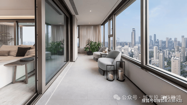 南向立面超高窗墙比,大面积的落地窗设计,赋予外立面晶莹通透的效果,消解建筑内外边界感,为室内纳入宽幕视野和丰沛采光,打造极简轻盈的视觉体验。售楼处电话400-8787-098接通后输入5678【营销中心】
