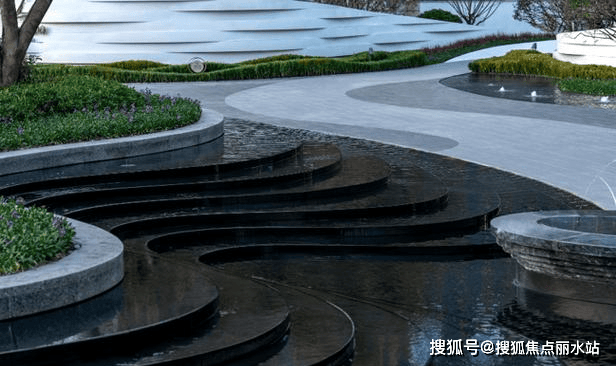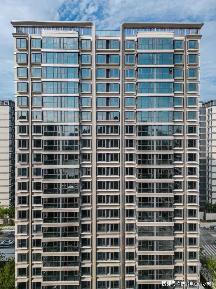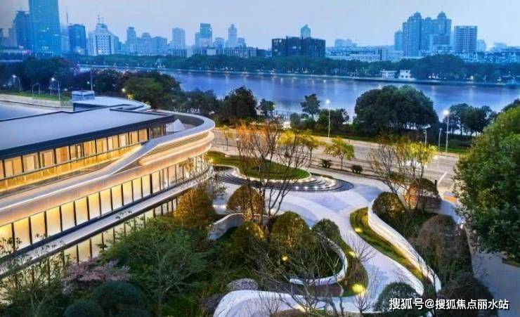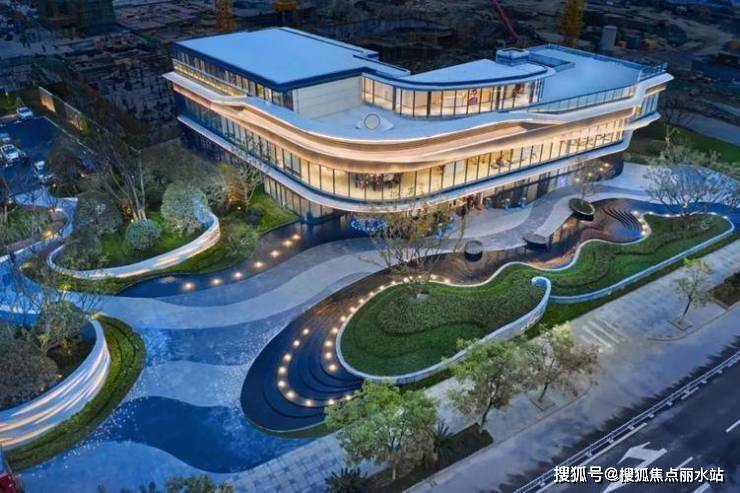 逸江源境建筑强调透明与轻质,采用石材+金属的搭配,铝板和大面积玻璃,展现舒展弧形线条,雕塑般的体量,质感细腻而纯净。