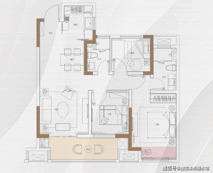 值得一提的是,105㎡户型在餐客厅的打造上,不设严格的功能定式,而是采用一体化的设计,将餐客厅区域打通,连通观景阳台,形成敞阔家庭活动空间。