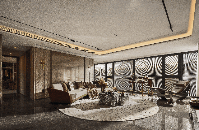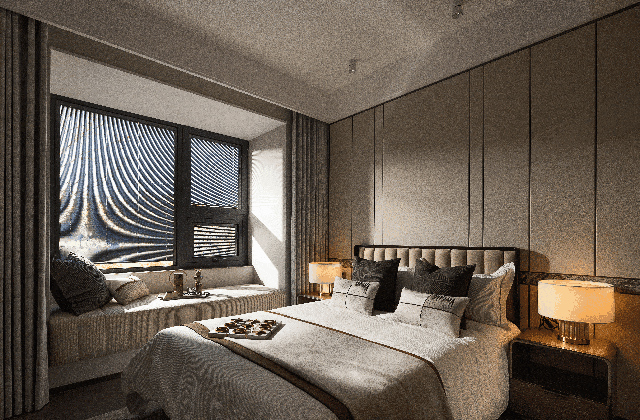 主卧高奢酒店总统套房设计,容纳卧室、奢华卫浴5件套、步入式衣帽间、搭配270°转角飘窗,视野无敌。