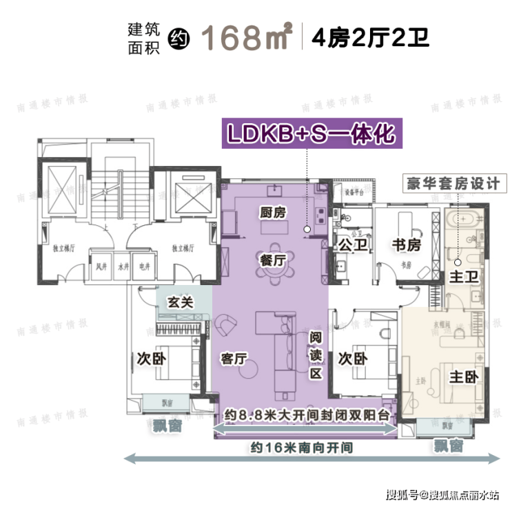 ①、约16米南向开间,8.8米大开间双阳台设计,无遮挡的景观视野,将室内空间的功能与室外空间形成联动。