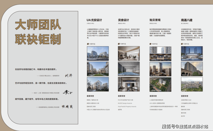 项目砸重金聘请大师团队上海尤安设计、奕舍设计、贻贝景观分别进行方案、精装和景观的设计,同时聘请南通八建作为施工单位,这些团队都是仁恒或绿城的御用团队。