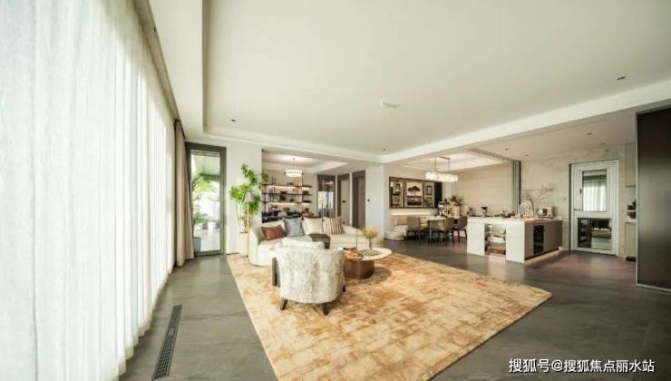 来看尺度,整个南向开间超16.8米,客厅开间就有约6米,如果家庭成员不多,不需要四房,可以和样板间呈现的一样,将一间朝南次卧和客厅连通,作为开放式书房,空间更明亮阔绰。