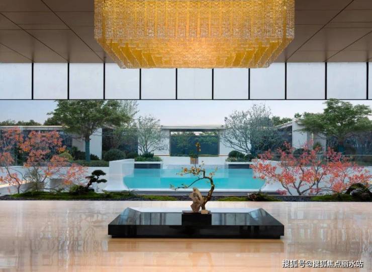 开发商通过巧妙的对景设计,让业主能直接望见下方的悬浮戏水池,池下悬挂悬瀑画面,虚实相生,很有意境。