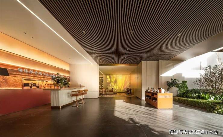 在下沉会所的落地窗前向外看,下沉庭院更如同一幅山水画。山石、悬瀑、乔木,错落间尽显韵味。四个角落分别栽种了名贵的老桩茶梅、羽毛枫、铁冬青、斜飘乌桕,四季皆景。