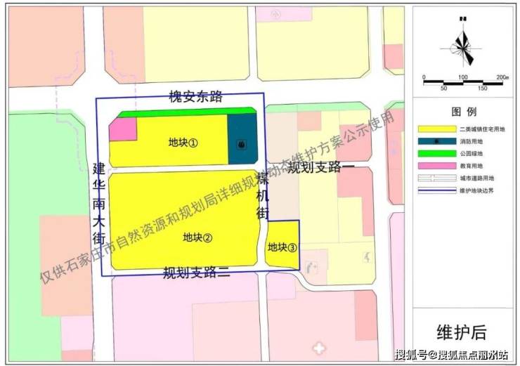 我们将其分为三个地块。地块①位置优势明显,紧邻槐安东路和建华南大街,一路之隔便是裕华万达,但它的用地性质较为复杂,除了主要的住宅用地,左上角为教育用地,东侧为消防用地。