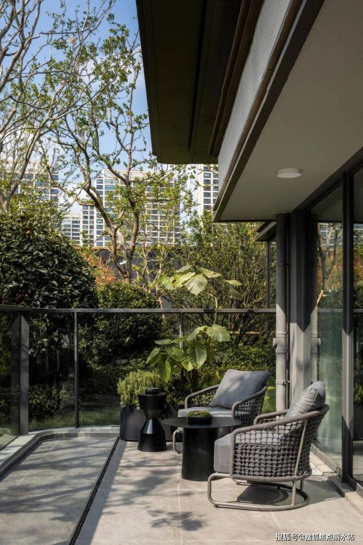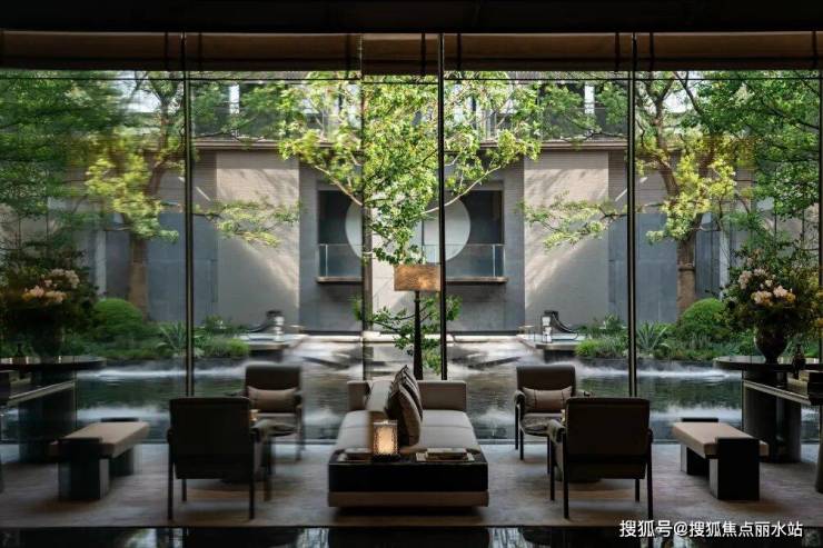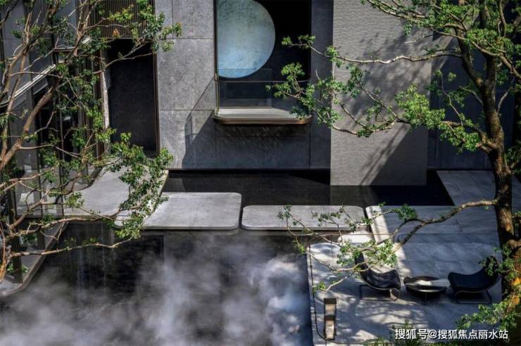 景观放大了树和水的元素,主要选用树王级稀贵树种,大面积的下沉式镜面水庭,中间缀以石材形成岛屿般的汀步、蜿蜒的岸线、碧波枕弦月,弧形的运用让艺术美感在园林里自由穿梭,也辗转出不同的场景韵味。