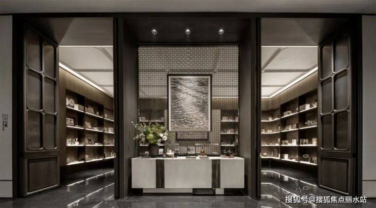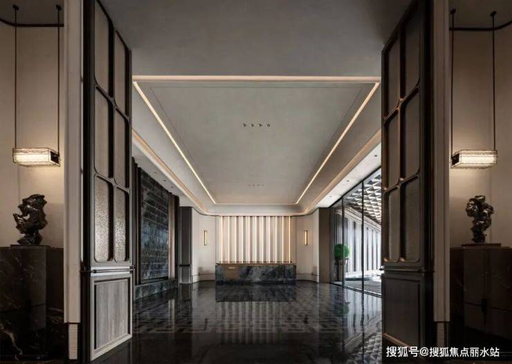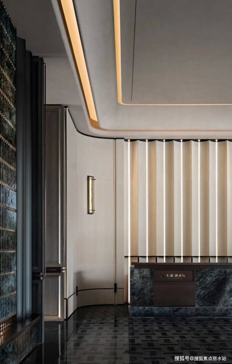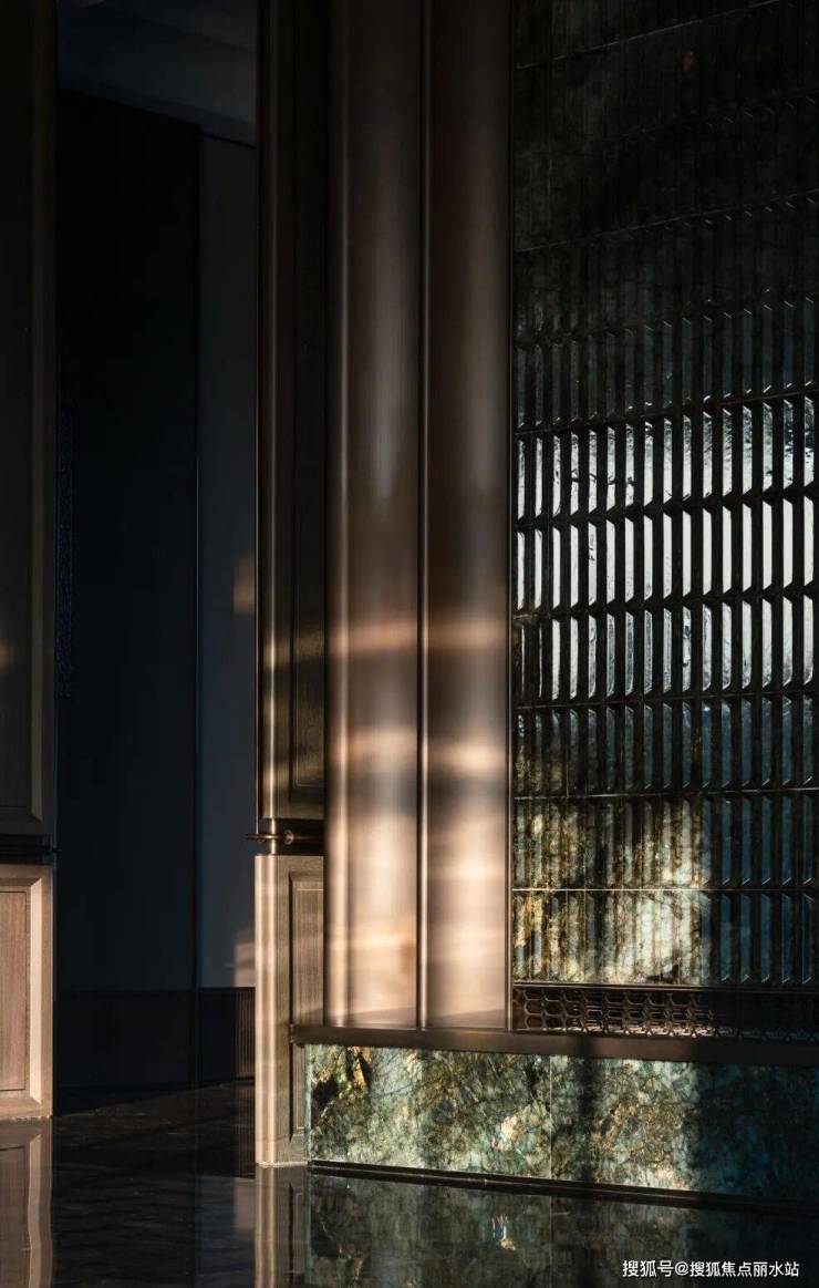 秉承中式建筑独有的东方情致,中轴对称的空间布局沉敛大气,手敲铜饰面熔铸水波纹琉璃灯具彰显出工艺之精湛,雕塑作品《倚石》静置于廊道的的两侧,太湖石峻深劲利的纹理再现重峦叠嶂之姿,勾勒出张弛有度的意境感。