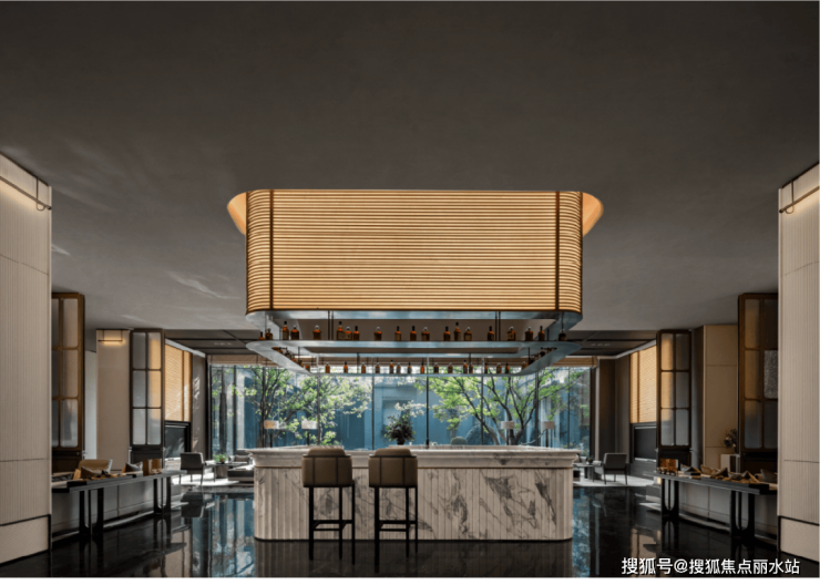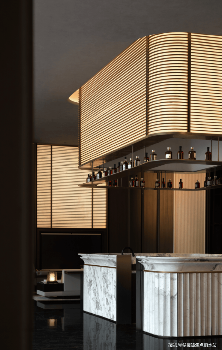 水吧的主体视觉结构通过层层叠加的线性肌理得以展现,与洽谈区贯通一体的布局设计,完美承载社交洽谈、娱乐小酌的日常需求。