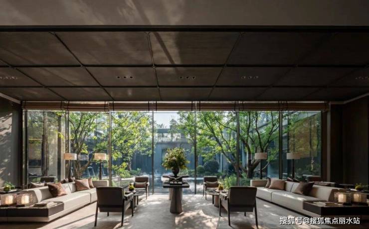 洽谈区引用中式园林的框景艺术手法进行搭建,整面通透的玻璃幕墙使“框”遁于无形,虚实相生的空间尺度之下,构筑此间隐逸自得的都市桃源。
