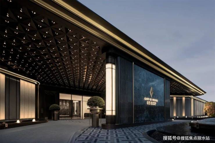 迎宾入口师法江南大宅,选用整面“蓝翡翠奢石”打造了照壁,约 80m超大尺度的景墙,宝石般的中心水景,给予人们酒店落客式的尊享归家体验。