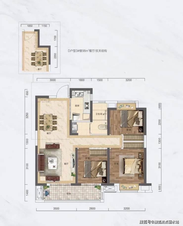 该户型为3号楼的中间户,98平三开间朝南户型,在区域内较为少见,双连通大阳台长6.3米,两个卧室带飘窗,均可以扩展面积。卫生间三段式设计,洗手台在卫生间外面,使用更便捷。