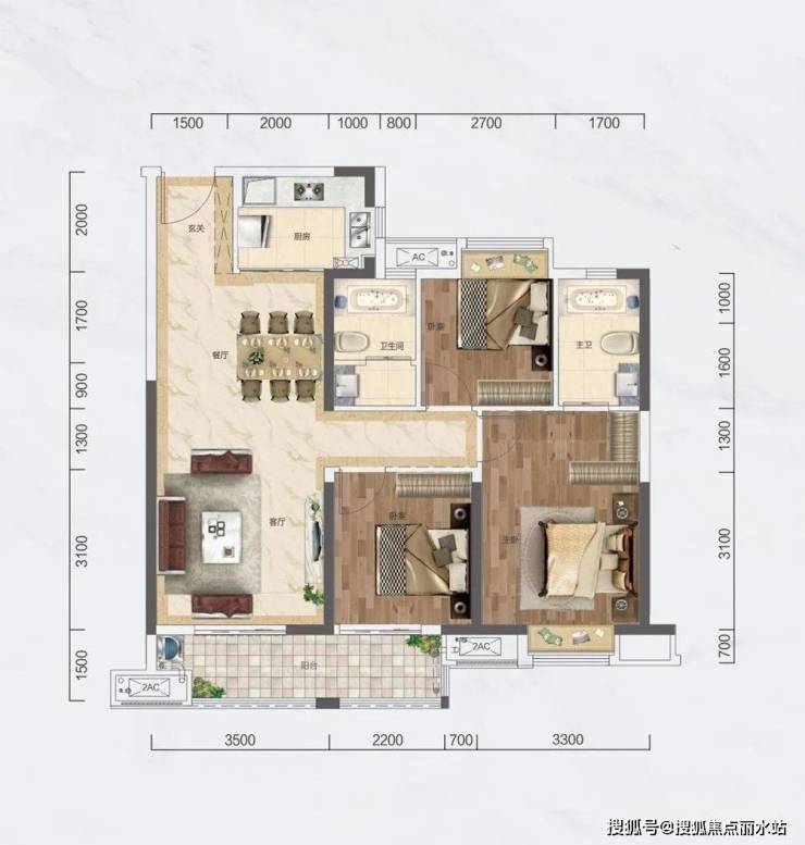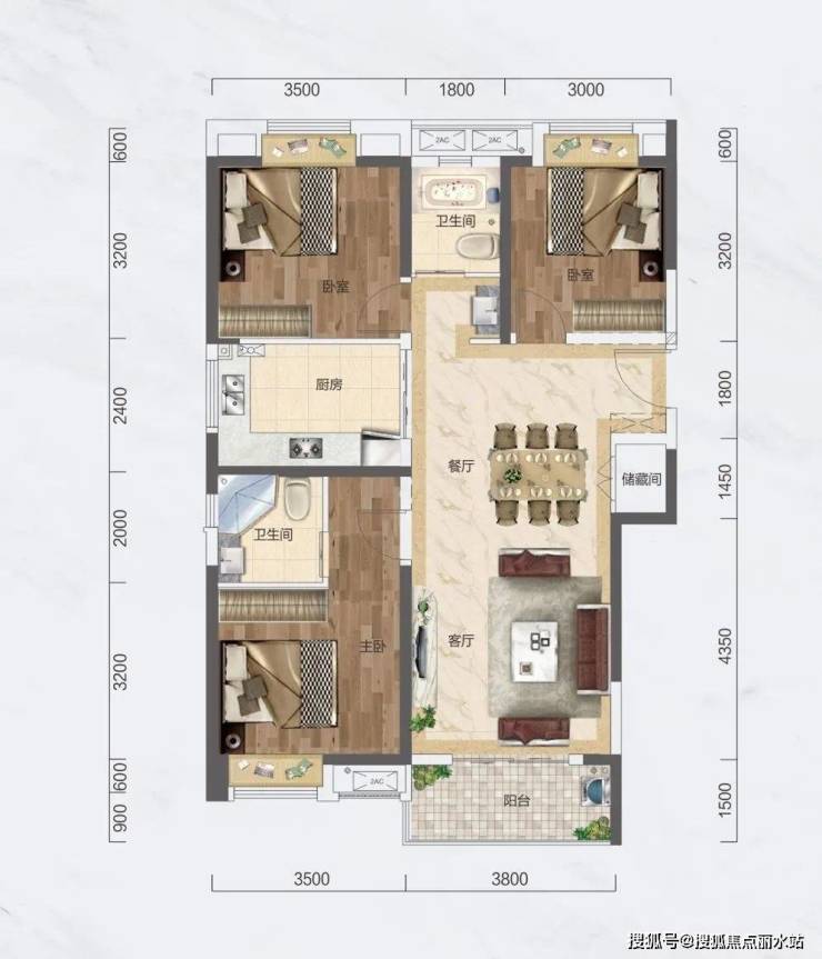 该户型为3号楼的边户,这个户型三面采光,布局合理,三个房间安置在房子的三个角落,相互不干扰,私密性极强;房间没有多余的走廊浪费面积,空间使用率高;三个房间都带飘窗,主卧套房设计,两个次卧空间也很阔绰,居住舒适性很高。