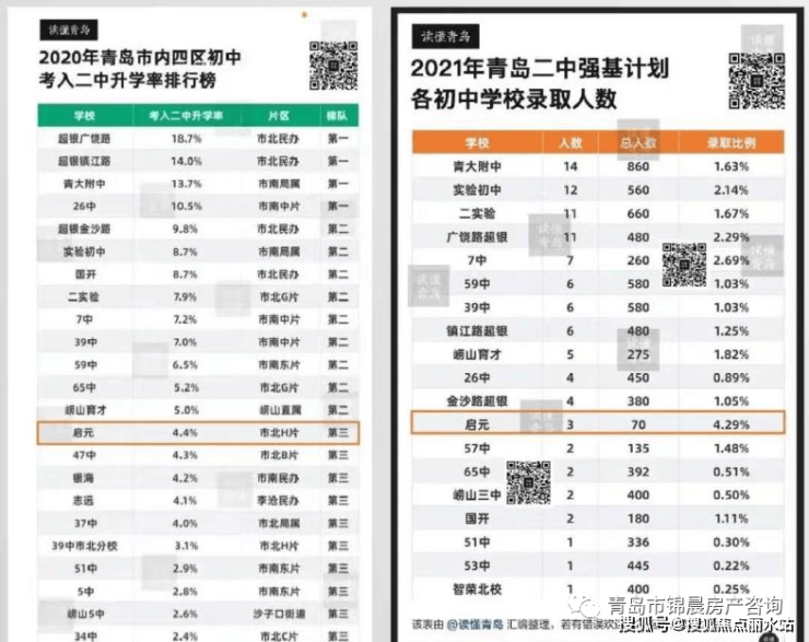 据公开的数据:启元学校的升高中率在市北区公办初中里,仅次于浮山后的学校;而金沙路超银中学2022年中考报录比达到了1.64:1,位居全市私立中学第一。启元学校作为青岛市区最早的九年一贯制学校,中考成绩突出,在市北区成为仅次于二实验和65中的优质学校,启元学校小学部已经学位预警。启元学校2020年中考达线率达到了73.3%,在市北区稳排前三名。