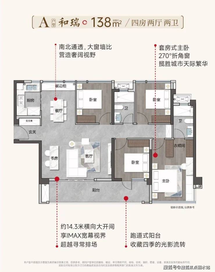 但真正的王牌在于户型。以约138㎡户型为例,其南向超宽面宽与“跑道式”阳台已属亮眼,而极少的室内承重墙设计,房子可以根据家庭不同阶段的需求自由改造。