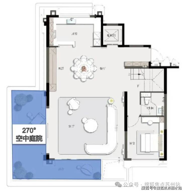 该户型打破 “中叠无庭院” 的固有认知,在首层就配置了270° 空中庭院。
