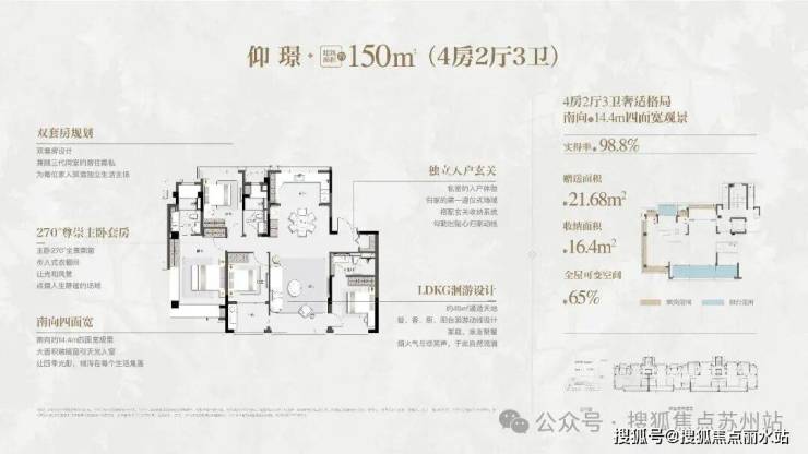 建发·璟园洋房的建面约150㎡户型,可以轻松实现四开间朝南+双套房设计,南向约14.4米四面宽观景,直追其他项目180㎡的人居尺度。