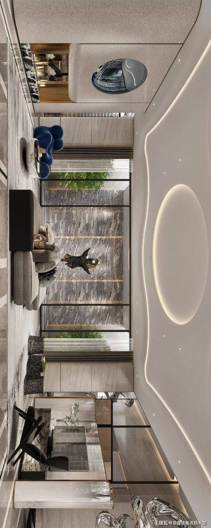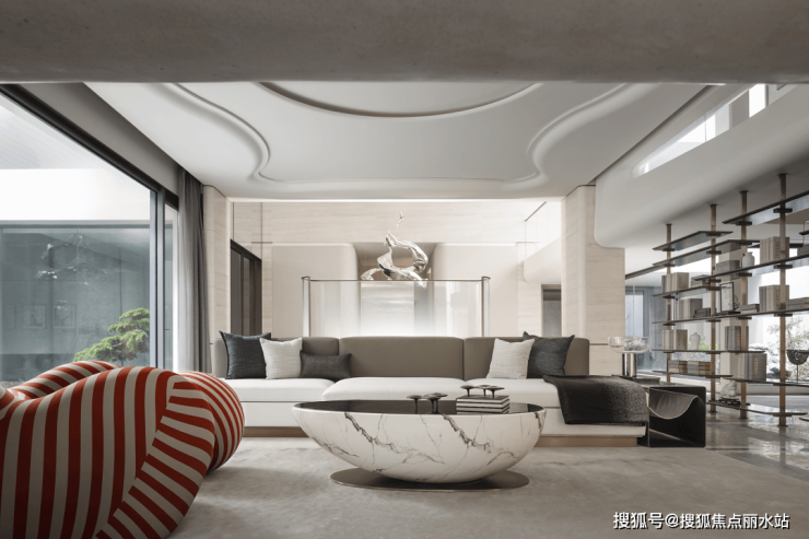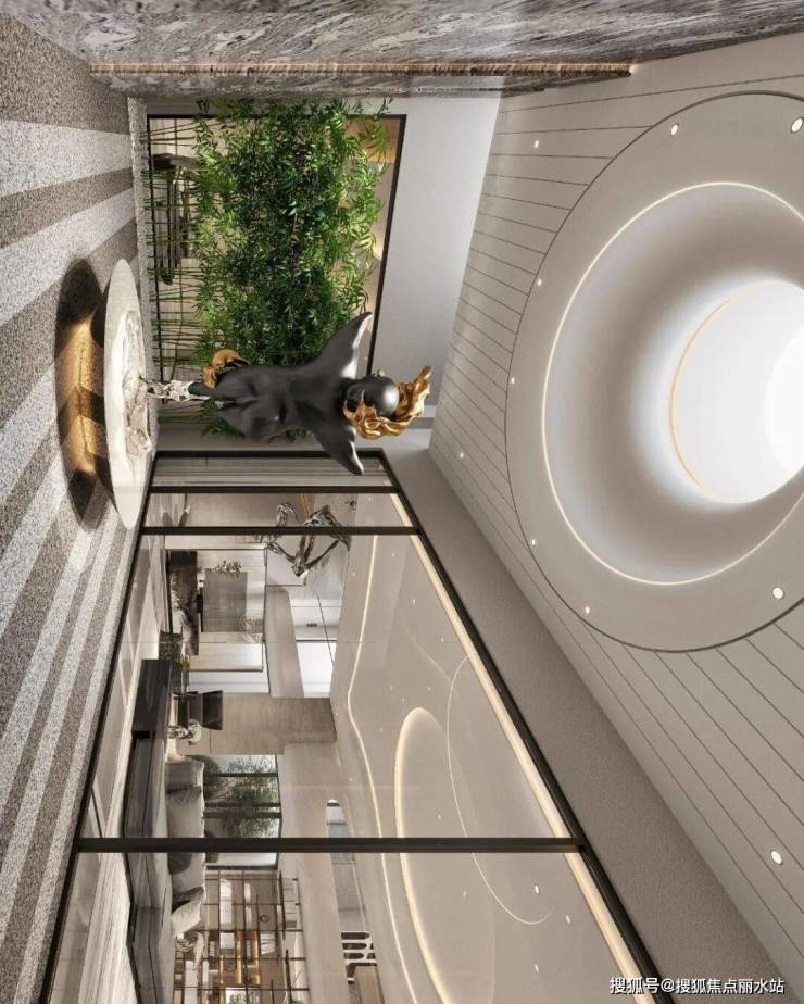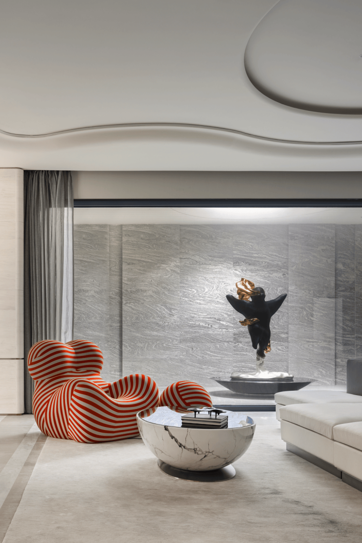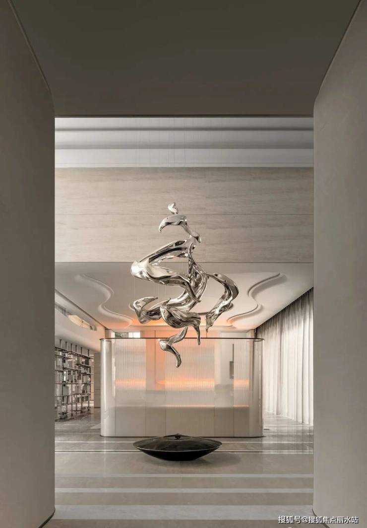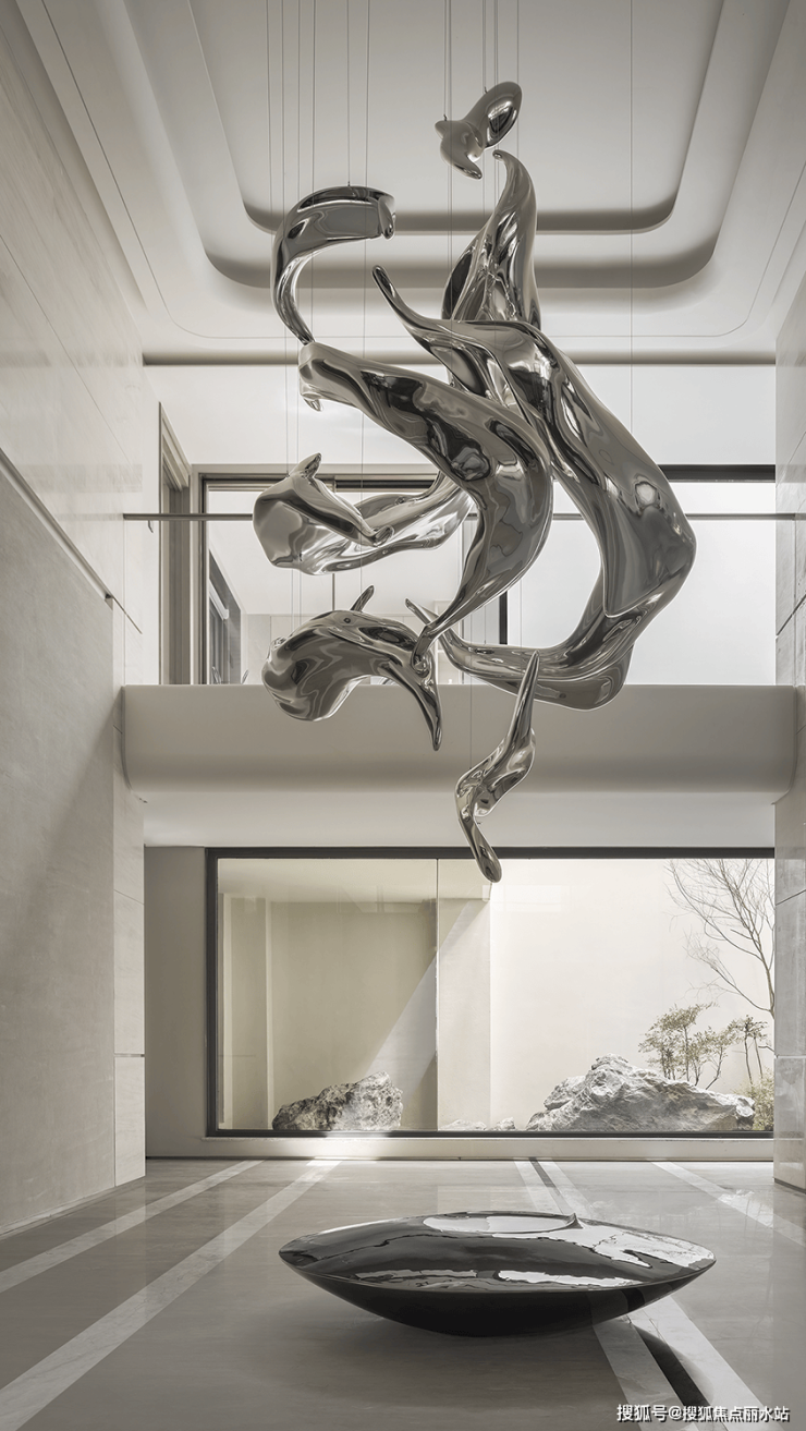 东西方文化关于风与水的想象被融合、物化为两尊雕塑,它们安放于地下,赋予其「标题性」,使之反客为主,由昏暗的冗余空间转化为整个别墅的诗意核心。