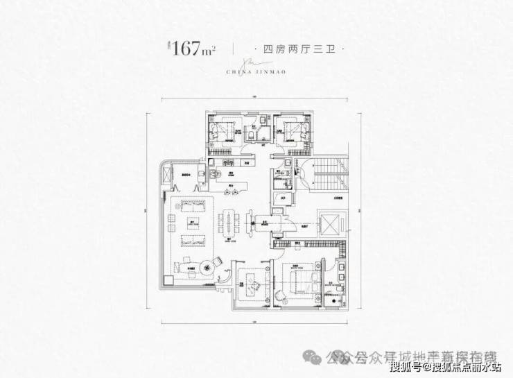 建面约167㎡四房,同样独梯入户,双套房,270度全景舱设计客厅,实际得房率约102.5%。