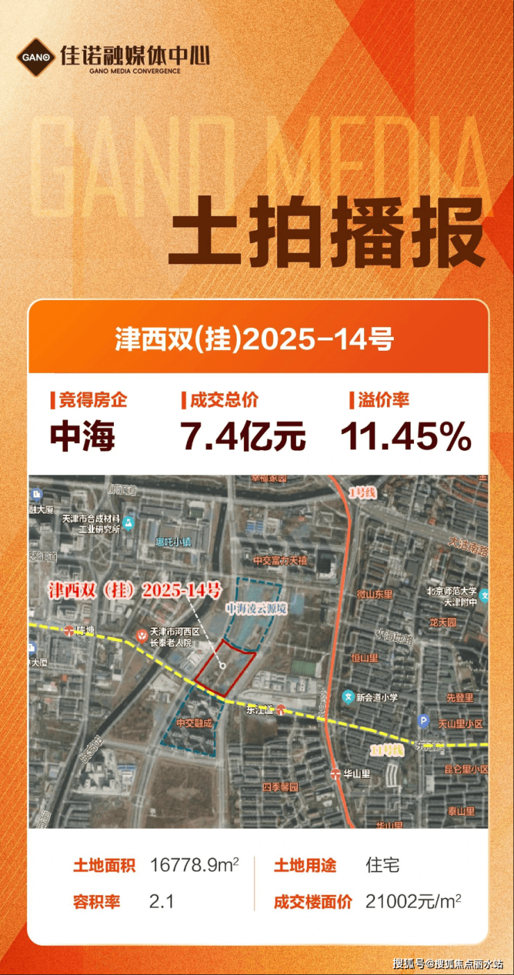 该地块位于河西区陈塘科技商务区双海道与枫林北路交口,容积率2.1,地上建筑面积为3.52万㎡。中海、绿城竞拍,最终由中海摘得,溢价率11.45%,成交总价约7.4亿元,折合综合楼面地价为21002元/㎡。