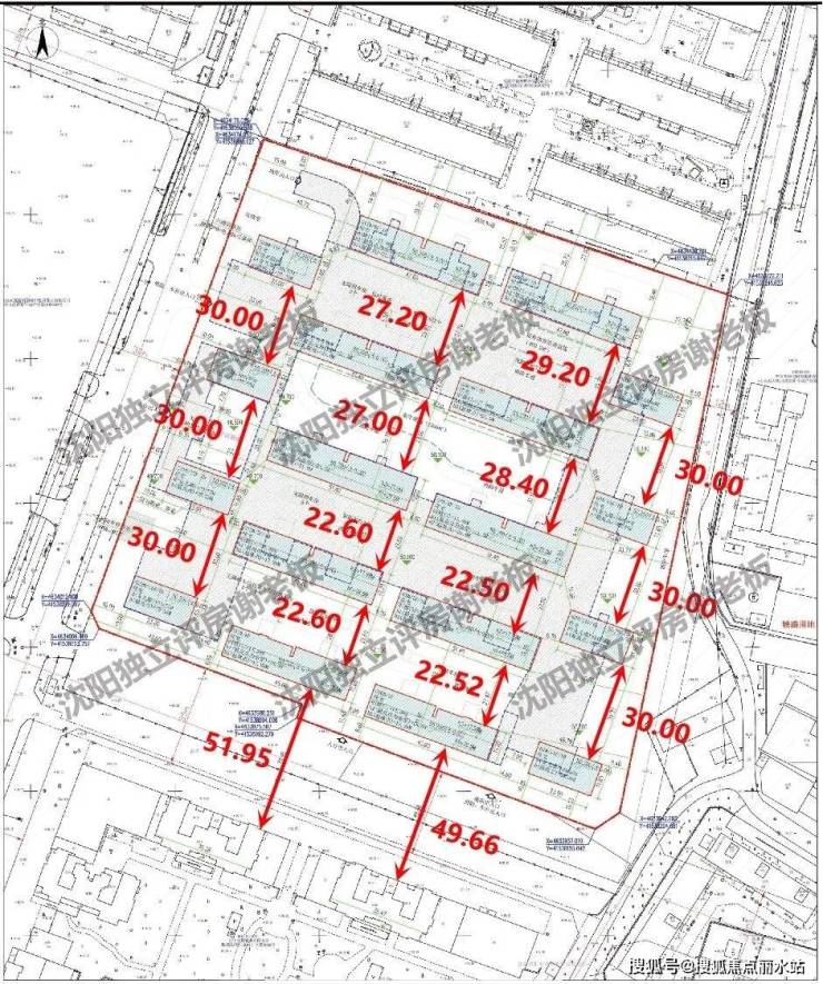 项目的小高楼间距在30米,6F洋房间距为27-27.2米,5F洋房楼间距22.5-22.6米。