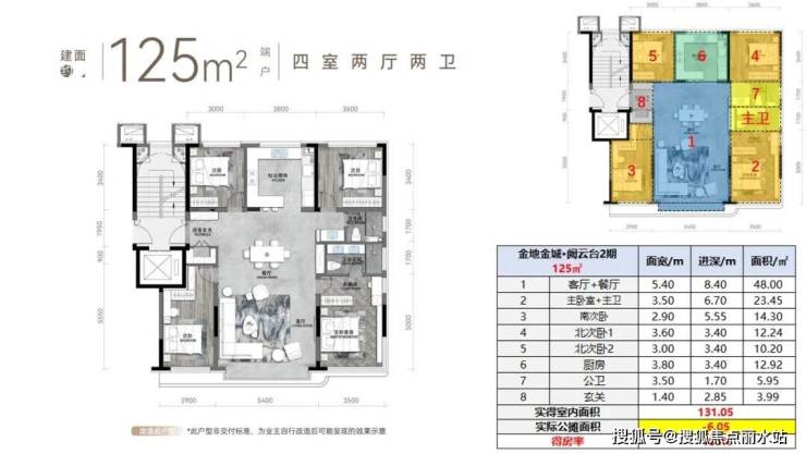 该户型套内面积可达131.05㎡(含赠送面积),得房率105%;