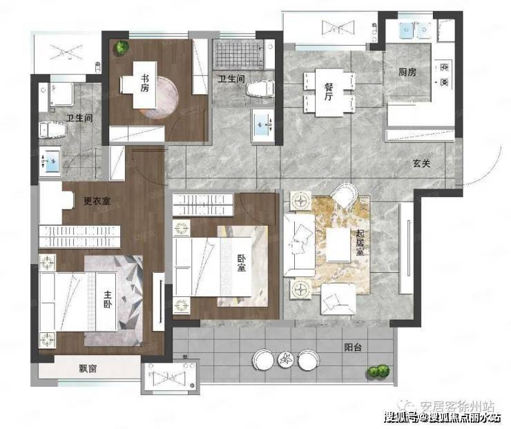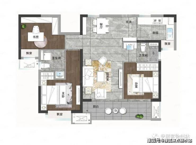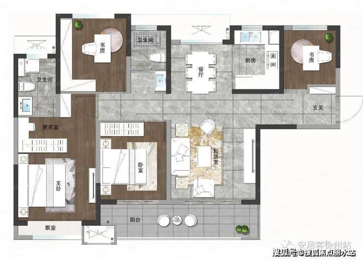 (1) 户型方正,生活动线明晰,动静分离;(2) 客厅套房,独立卫浴,衣帽间,与大飘窗;