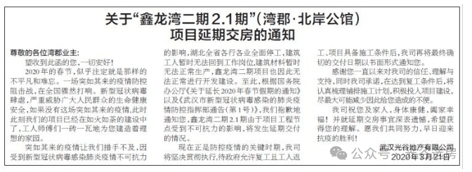 湾郡北岸公馆合同规定的交付时间是2020年12月28日交房,但是中间因为疫情的原因,在2020年3月21日就发布了延期的公告。