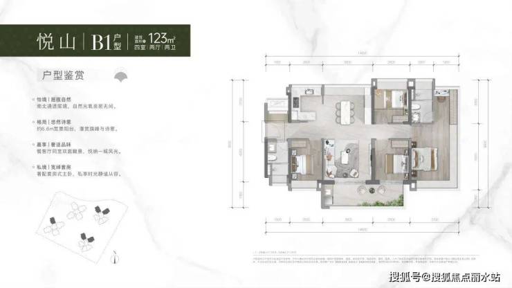1号楼B1户型设计独特,两条腿朝向不同,西北向和西南向均有分布。虽为竖厅设计,但实现了四开间布局,一侧多个飘窗,采光极佳。户型灵活,可作三居室或四居室。打掉次卧,客厅可变宽敞大横厅,开间超6米,豪宅风范尽显。唯一遗憾是仅有一个阳台,一条腿朝北,在东莞多雨天气可能晒不到太阳。