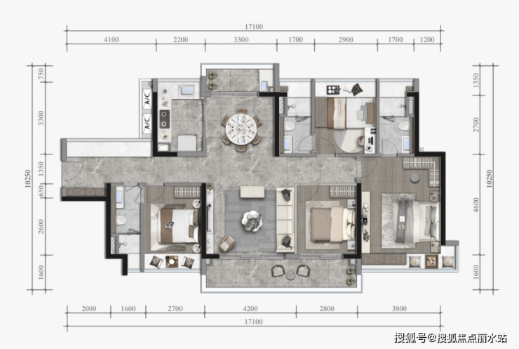 以143㎡四房为例,四开间朝南,多套房设计,除常规的主人房套房设计外,老人房、儿童房都是套房设计,满足全家人的学习、休息和娱乐需求,体现了奢阔的大空间生活。