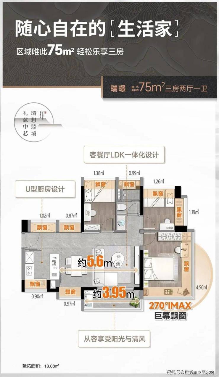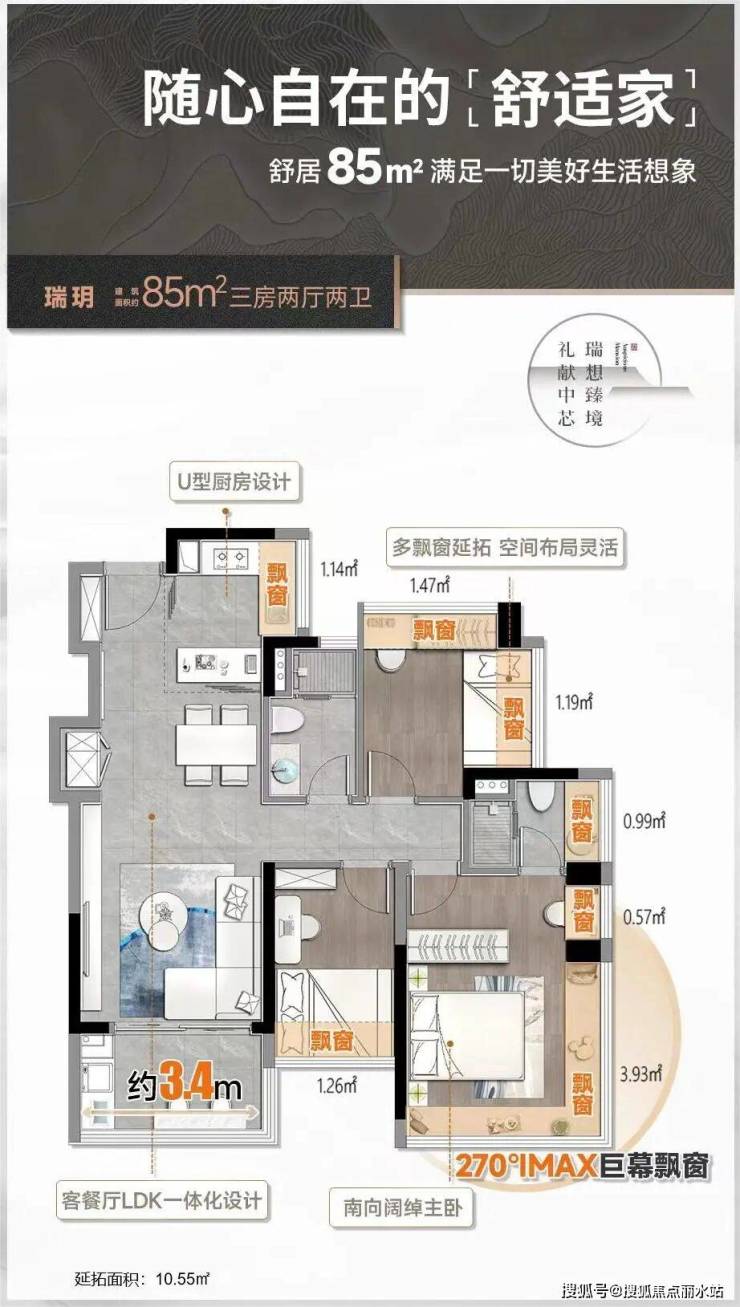 约85㎡三房两厅两卫:灵动竖厅,科学布局,客餐厨LDK一体化,户户270°豪宅飘窗,可分可合中西双厨,实用面积达98%
