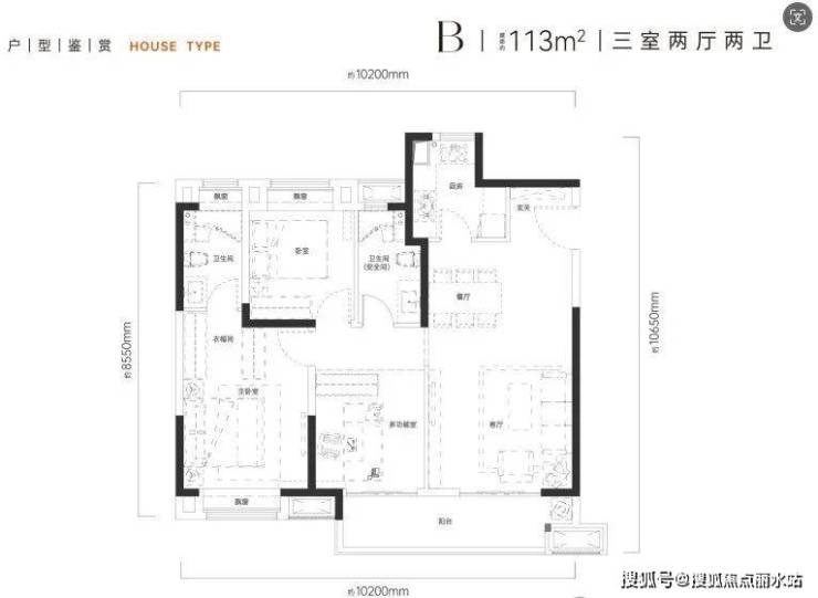 2、3、5号楼的边户,进门设计了玄关,私密性更强;整个南向采光面达到10.2米,采光面更大;同样也是三开间朝南,带双面宽阳台,对比97/98平三房,113平米的三房赠送飘窗更多,加上又是南北通透的边户,居住体验更舒适。