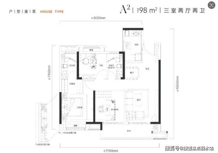 2、3、5、6号楼的中间朝南户,跟97平户型基本是一样的格局,南向整个面宽也都是9.7米,就是进深上有一些区别,97平户型整个进深是9.75米,98平户型是10.65米,区别在于厨房,一个是横向布局,一个是纵向布局。