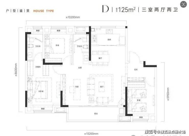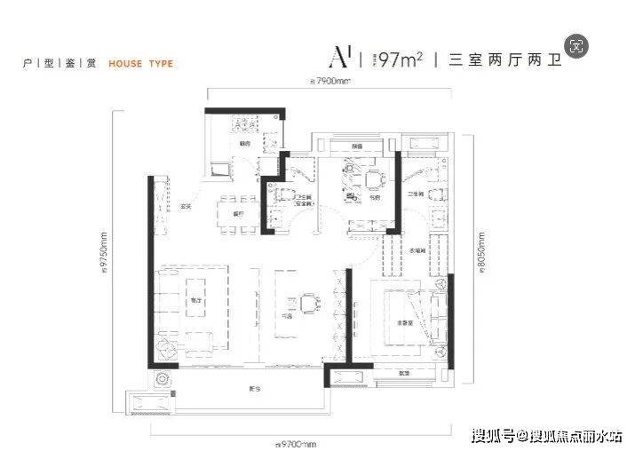 2、3、5、6号楼的中间朝南户,三开间朝南,整个户型还比较方正,南向带双面宽阳台,后期可以改造成大横厅设计;主卧带飘窗,北面书房带飘窗,有一定的拓展空间;97平的三房两卫,功能性还可以。