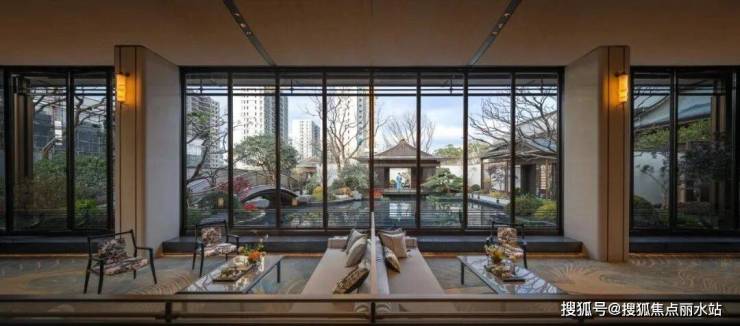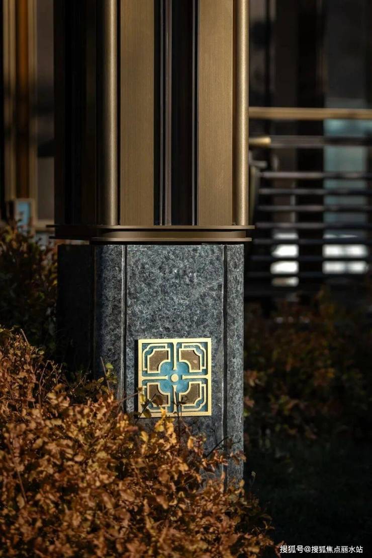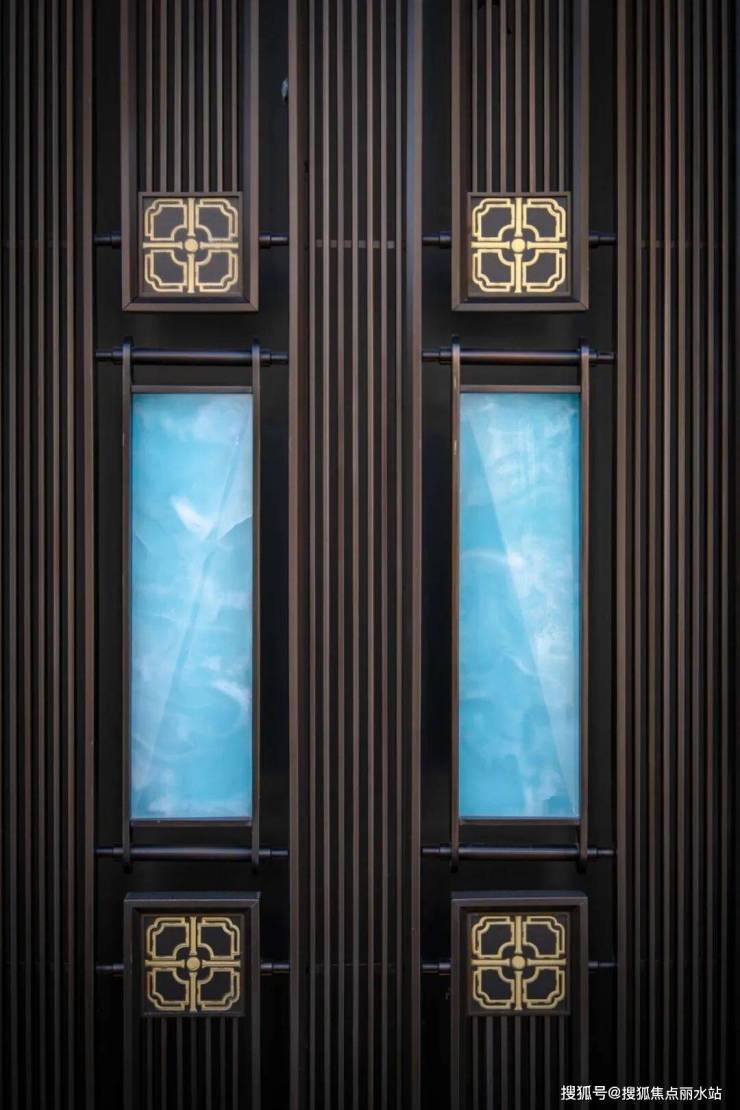 立面线条流畅且富有韵律,轻盈剔透又宛如瓷器般素净,取自《金陵图》中的西水门造型,为了彰显府门之气派,还特意做了起翘的“双檐”设计,檐口被精炼成一道镂空向上弯曲的金色线条,既表现宋式建筑舒展平远的姿态,又有超凡脱俗的美好寓意。