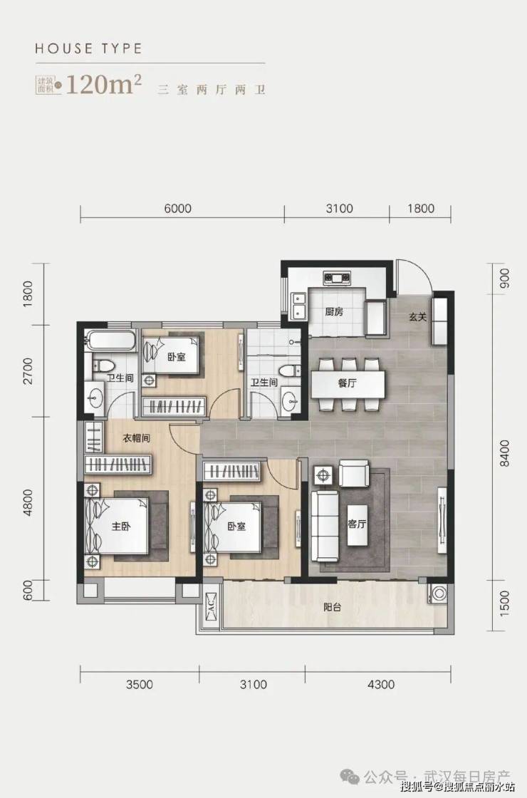 A2#楼—E户型 建筑面积约120㎡ 三室两厅两卫.三开间朝南,大面宽设计,采光面更佳